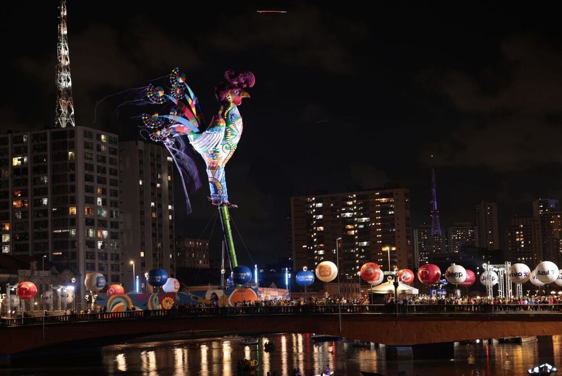 Galo Gigante 2026 sobe na Ponte Duarte Coelho - Foto: Felipe Ribeiro/ Folha de Pernambuco FolhaPE Um dos momentos mais aguardados pelos pernambucanos e turistas ocorreu nesta quarta-feira (11). O Galo Gigante, localizado na Ponte Duarte Coelho, área central da capital pernambucana, foi erguido com um evento que simboliza a abertura do Carnaval do Recife , reunindo música, dança e tradição. A subida do Galo Gigante já está consolidada no calendário do Carnaval recifense. A cerimônia foi acompanhada pelo prefeito do Recife, João Campos, e foliões que aguardam a celebração do Galo da Madrugada no Sábado de Zé Pereira. A alegoria ficará em destaque na Ponte Duarte Coelho até o domingo seguinte após a Festa de Momo, no dia 22 de fevereiro. O espetáculo cultural da subida do Galo Gigante foi conduzido com apresentações de Getúlio Cavalcanti, Bloco das Ilusões, Canindé do Recife, Clarins de Ouro de Pernambuco, Orquestra Som Brasil/Trio Som Brasil e Cia de Dança Perna de Palco.