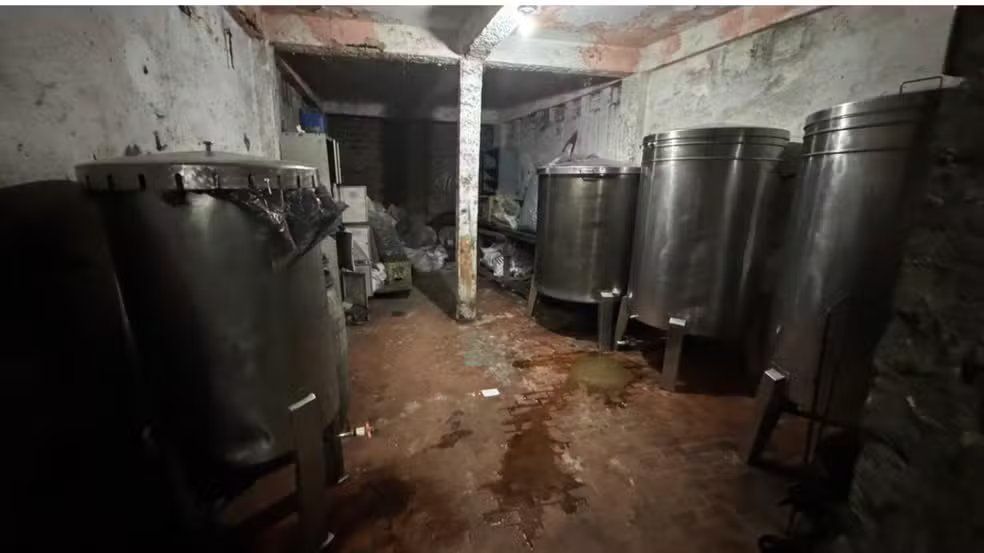 No local, foram encontradas várias garrafas vazias prontas para serem envasadas, rótulos, tampas, galões de álcool, bebidas já envasadas e maquinário precário.