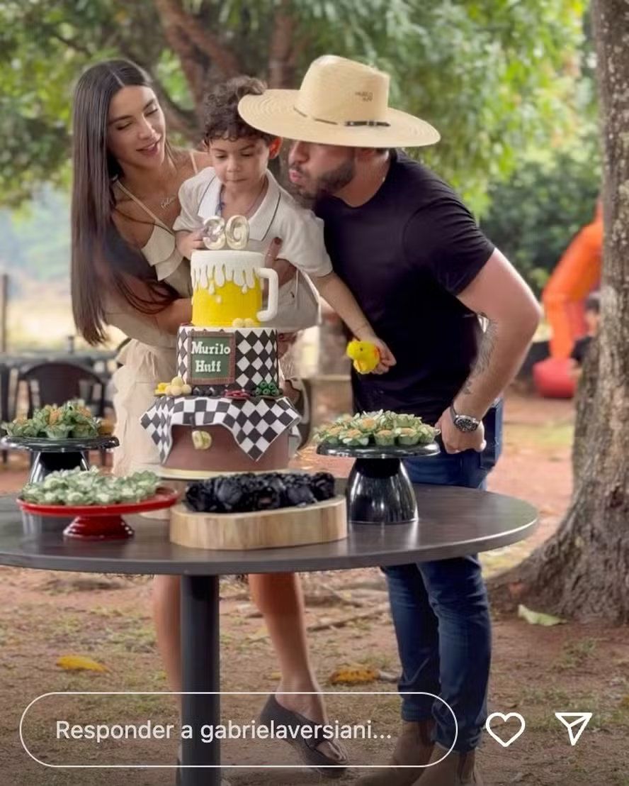 O cantor Murilo Huff comemorou seus 30 anos com uma festa ao ar livre cercada de amigos, familiares e o filho Léo, de 5 anos, fruto de seu relacionamento com Marília Mendonça. Nas redes sociais, a noiva de Murilo, Gabriela Versiani, compartilhou registros do evento e mostrou o momento em que o pequeno ajudou o pai a soprar as velinhas do bolo. No vídeo, Léo aparece no colo de Gabriela, sorridente, enquanto o público canta “Parabéns pra você”. O bolo, em formato de boteco, trazia detalhes com petiscos e uma caneca de chope como decoração.